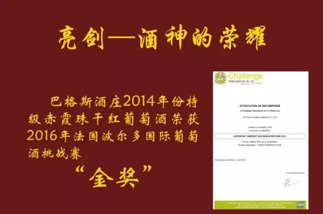 2016年4月25日,银川巴格斯葡萄酒庄收到了来自葡萄酒圣地----法国波尔多的喜讯:巴格斯酒庄2014年份特级赤霞珠干红葡萄酒荣获了2016年法国波尔多国际葡萄酒挑战赛-“金奖”。