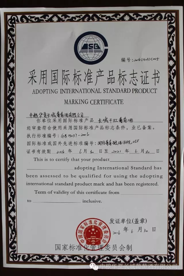 6月30日,中粮华夏长城葡萄酒获得河北省质量技术监督局颁发的“采用国际标准认可证书”和“采用国际标准产品标志证书”,有效期五年。