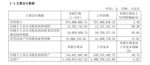 16日晚间,威龙葡萄酒股份有限公司(SH603779)发布2016年中报,报告显示,其2016年上半年营业收入 373,606,665.75元(约3.74亿元),同比增长4.4%;归属于上市公司股东的净利润为21,201,752.04元(约2120万元),同比增长90.36%;经营活动产生的现金流量净额7510万元,比上年增长47.02%。基本每股收益0.13元/股,比上年增长85.71%。