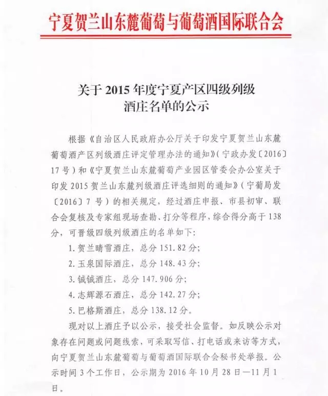 根据《自治区人民政府办公厅关于印发宁夏贺兰山东麓葡萄酒产区列级酒庄评选管理办法的通知》(宁政办发〔2016〕17号)和《宁夏贺兰山东麓葡萄产业园区管委会办公室关于印发2015贺兰山东麓葡萄列级酒庄评选细则的通知》(宁葡局发〔2016〕7号)的相关规定,经过酒庄申报、市县初审、联合会复核及专家组现场查勘、打分等程序,综合得分高于138分,可禁忌四级列级酒庄的名单如下: