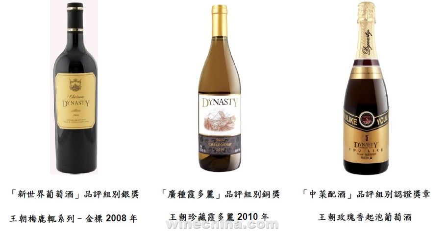 王朝分别以「王朝梅鹿辄系列–金标2008年」荣获「新世界葡萄酒」品评组别银奖,并成为该组别唯一获奖的中国酒品;干白葡萄酒「王朝珍藏霞多丽2010年」在「广种霞多丽」组别获得铜奖;及「王朝玫瑰香起泡葡萄酒」于「中菜配酒」组别获得认证奖章。