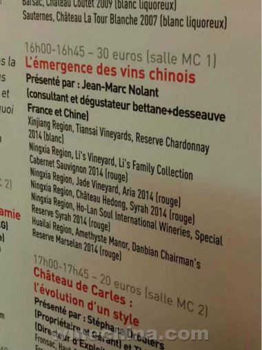本次大师班的主讲人是贝丹德梭酒评人老马Jean-Marc Nolant,穿梭在中法之间的酒评人老马对中国酒庄有着深厚的感情,这次带来的2014年份是近年来中国葡萄酒各产区平均表现最佳的一个年份。除了天塞酒庄、贺东庄园外,嘉地酒园、贺兰神国际、紫晶庄园、利思酒庄都是第一次亮相巴黎酒展,它们也都是在2016贝丹德梭北京品鉴会上脱颖而出的新晋酒庄。