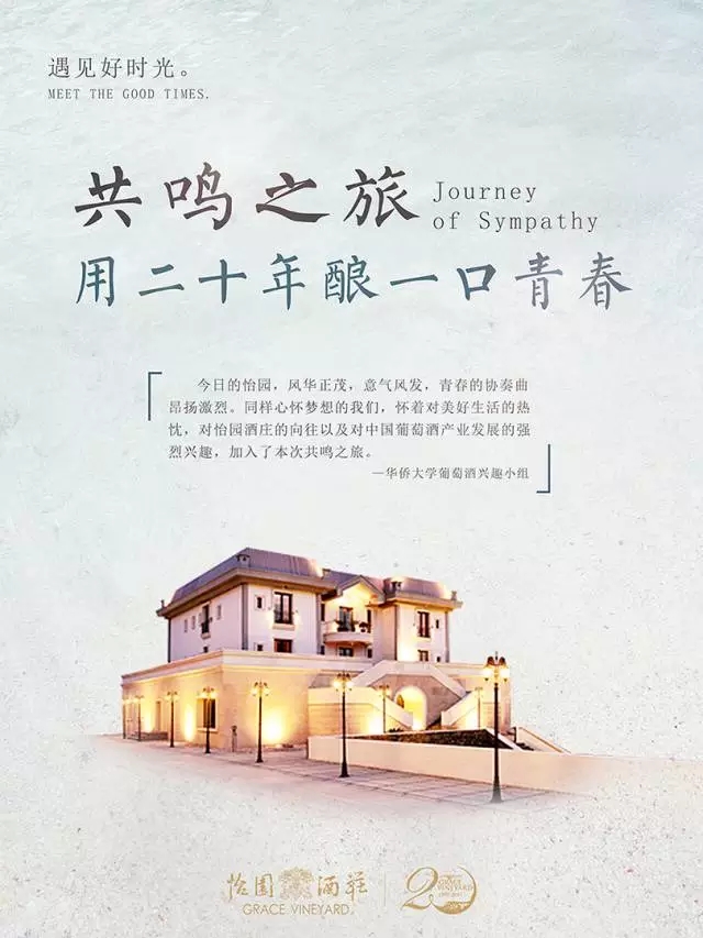 今日之怡园,芳华正茂,意气风发,青春的协奏曲昂扬激烈。同样心怀梦想的我们,怀着对美好生活的热忱,对怡园酒庄的向往以及对中国葡萄酒产业发展的强烈兴趣,加入了本次共鸣之旅。在本次活动中,我们会亲身实践,去感受怡园葡萄酒活力跃动的生命力,同时庆贺怡园酒庄20周年。希望怡园酒庄精致的品质,为年轻一代所熟知,共同见证中国葡萄酒行业黄金的20年。