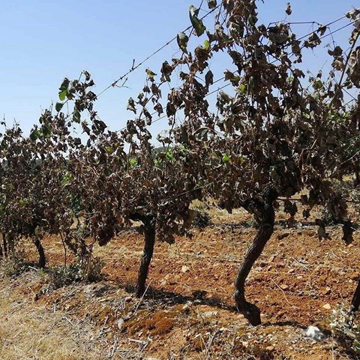 他的葡萄园中,位于边缘以及地势较高区域的葡萄藤,受到的影响最为严重。热浪过后,这里的葡萄藤看起来像是被闪电击中,叶子呈现出烧焦枯萎的状态。