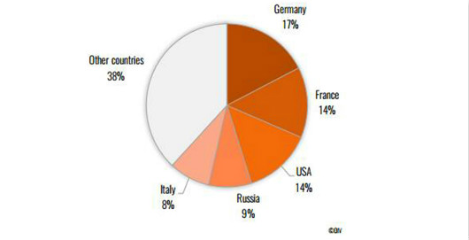 按价值计算,美国是最大的进口国(11.12亿欧元),其次是英国(7.23亿欧元),日本(5.23亿欧元),德国(4.25亿欧元),新加坡(3.08亿欧元)。自2008年,美国、日本市场有了显著增长,年平均增长率分别为9%和7%。