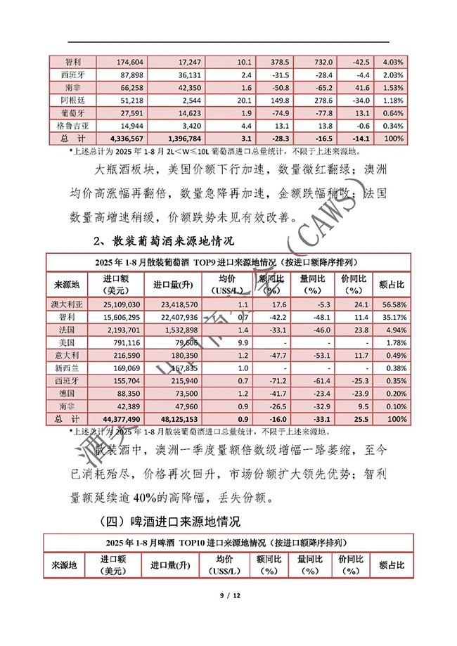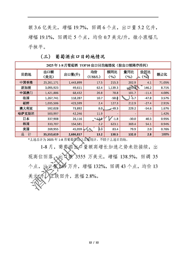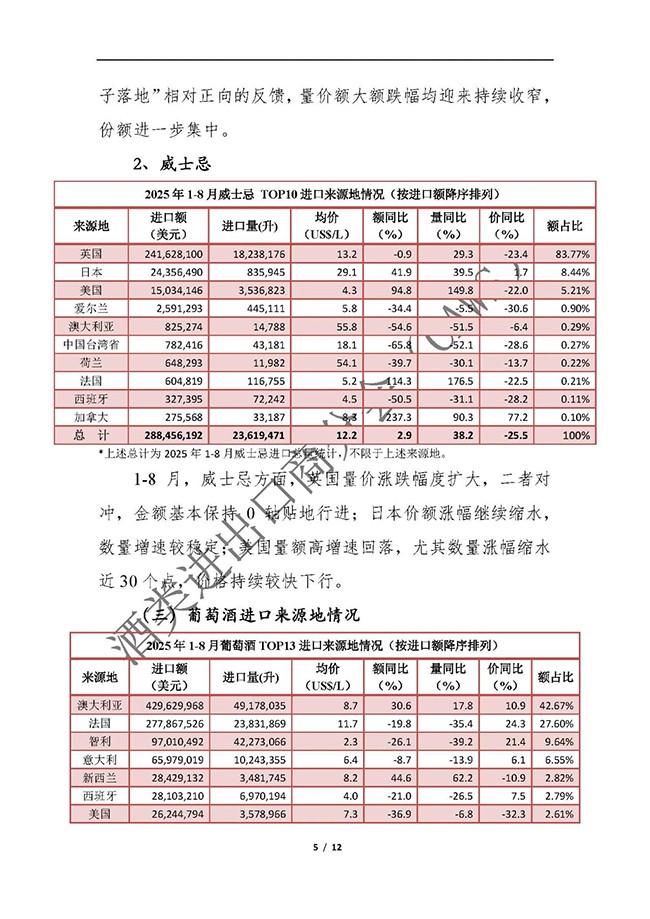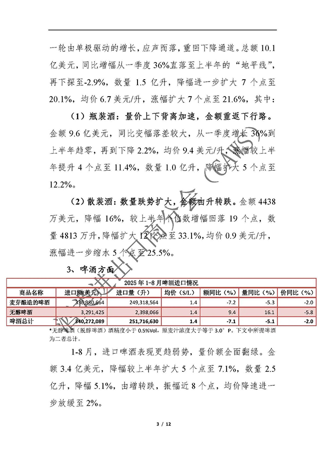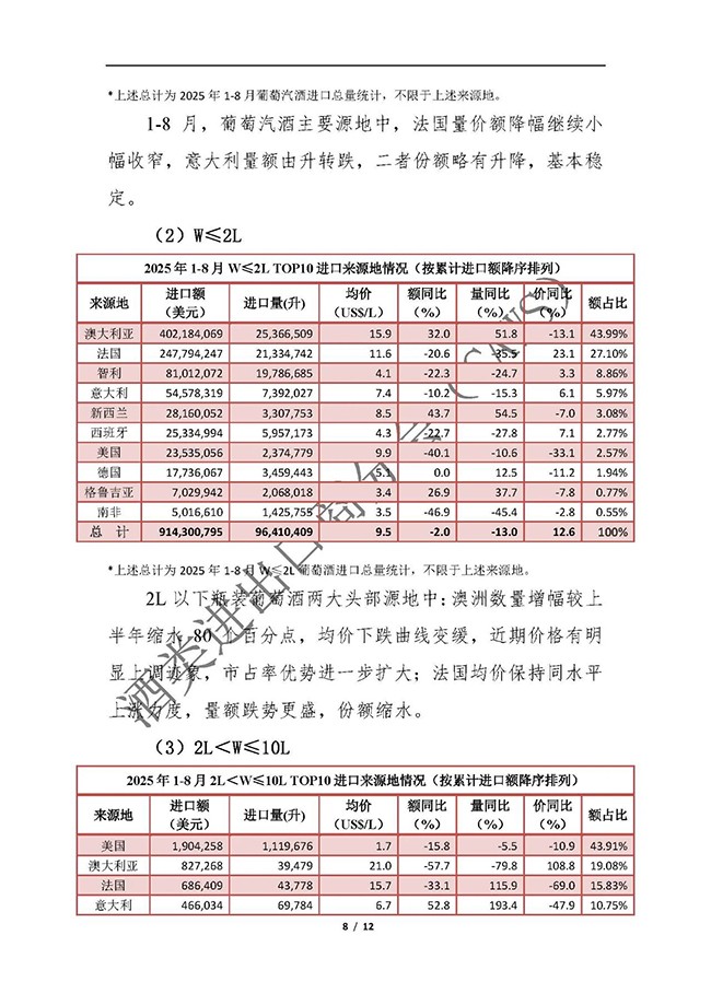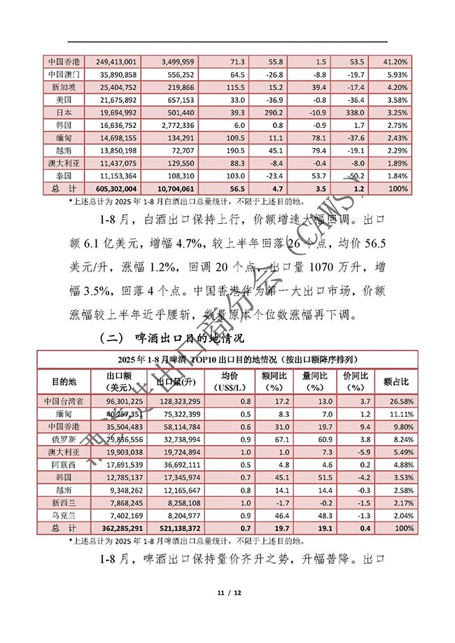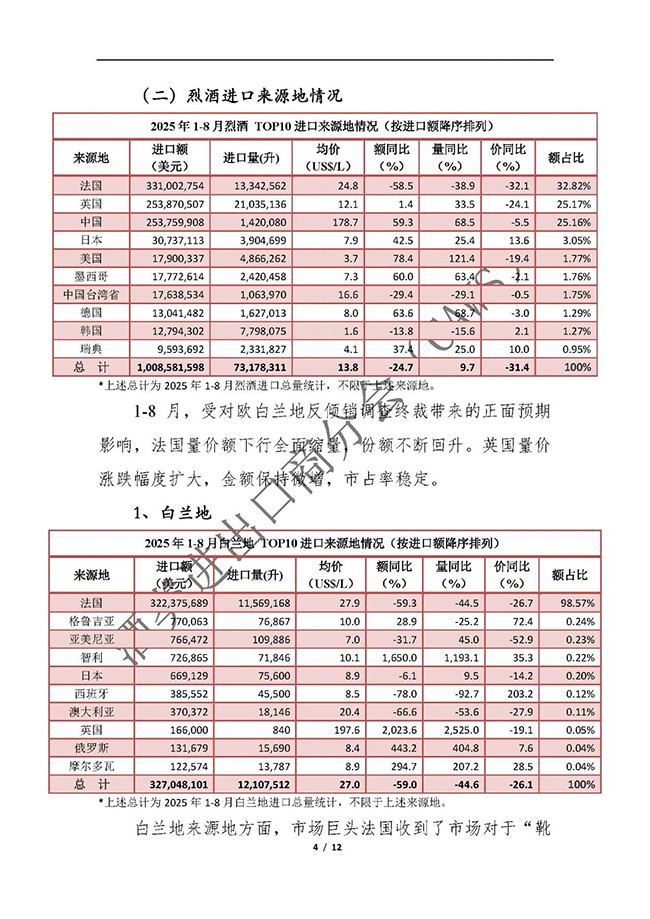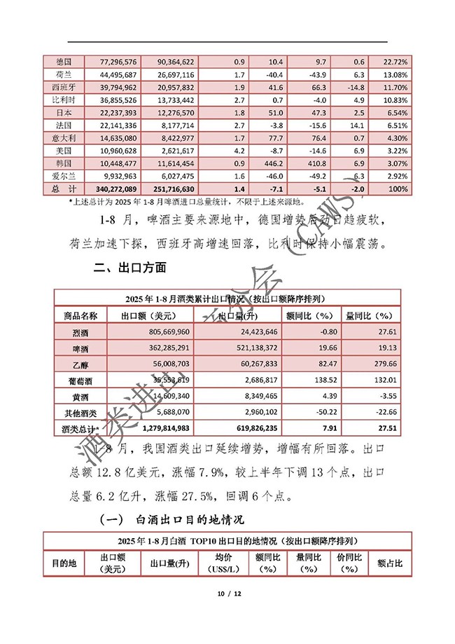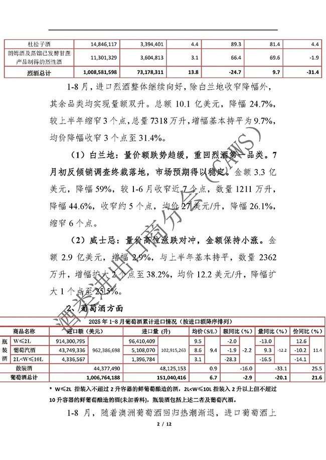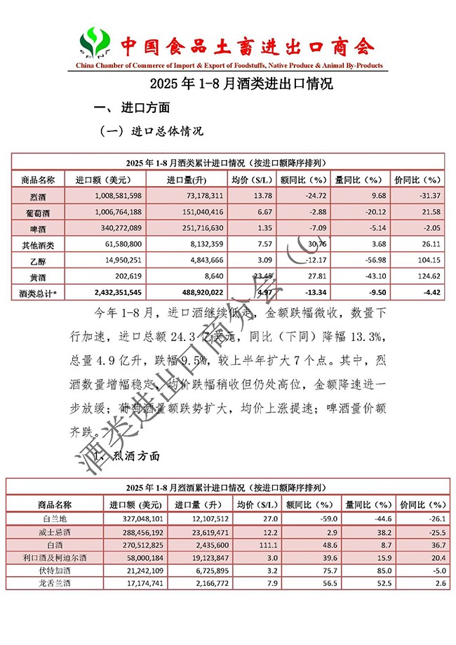 2025年1-8月我国酒类进出口情况
