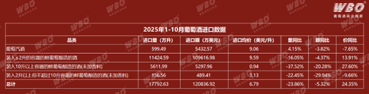 从累计情况来看,2025年1-10月我国葡萄酒累计进口量约1.78亿升,同比下降23.86%;累计进口额约12.08亿美元(约合人民币85.98亿元),同比下降5.32%;整体均价约6.79美元/升,同比上涨24.35%。市场整体复苏仍面临压力,进口商进口节奏偏向谨慎。