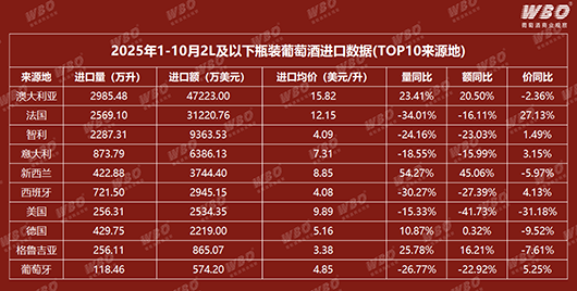 2L及以下瓶装葡萄酒来看,1-10月累计进口量约1.14亿升,同比下降16.05%;累计进口额约10.96亿美元,同比下降4.37%;均价9.59美元/升,同比上涨13.91%。