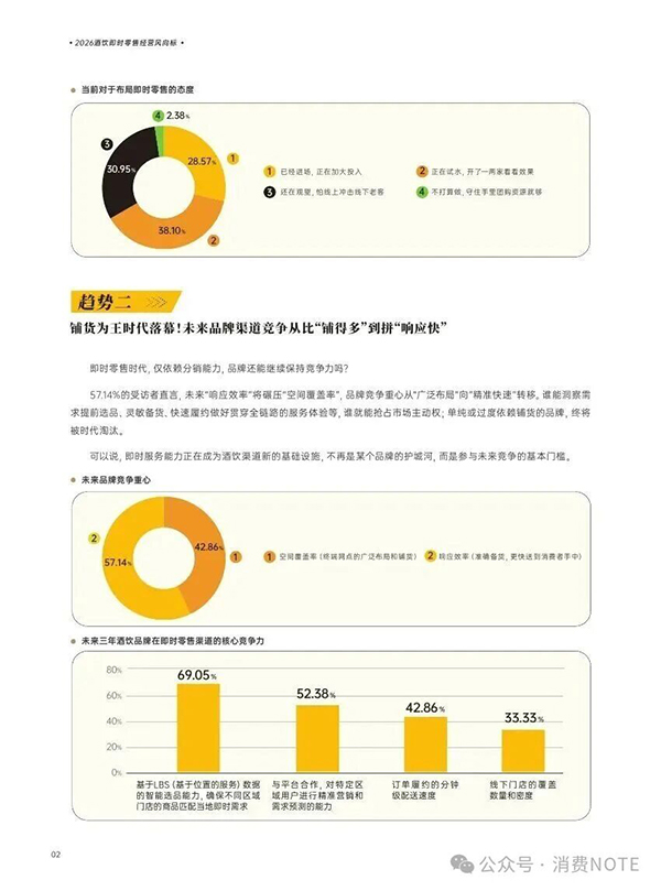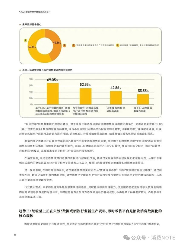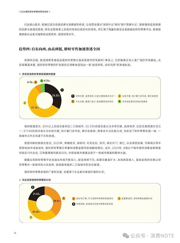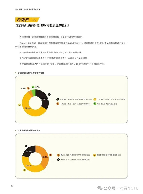 酒饮行业正经历从“铺货为王”到“效率优先”的深刻变革。传统依赖广泛终端覆盖的竞争模式正被颠覆,57.14%的受访者认为未来市场竞争中,响应效率将全面超越空间覆盖率。品牌竞争重心正转向精准与快速,单纯依赖铺货能力的品牌面临淘汰风险。在即时零售渠道,核心竞争力已转变为数据驱动的智能服务能力:80%的受访者将基于LBS数据的智能选品能力视为核心,确保商品精准匹配区域即时需求;69.05%的受访者看重分钟级订单履约速度;超半数受访者关注对特定区域用户的精准营销与需求预测能力。即时服务能力正成为酒饮渠道新的基础设施,是参与未来市场竞争的基本门槛。行业经营决策依据也在快速更迭,88.1%的受访者认为即时零售平台提供的实时消费数据比个人从业经验更具参考价值,数据已成为行业新的生产资料。超半数受访者希望平台能通过数据能力分析用户画像、监控商品动销、动态调整策略,并指导区域备货选品、降低库存甚至精准选址。市场地域格局同样在重塑,即时零售并非高线城市专属,正沿自东向西、由高到低的轨迹快速渗透全国。2025年,B级及以下城市酒饮消费金额增速约70%,订单量增速近50%,远超一线城市及行业大盘。新疆、湖北、陕西、河南等多地中西部地级市和县级市已实现订单量与消费金额翻倍增长。38.1%的受访者视门店上线即时零售为行业必经之路,40.48%的受访者将其视为传统渠道的重要补充和业绩增长关键抓手。超九成二三线城市受访者表示当地即时购酒服务已非常方便或已有覆盖,并会偶尔使用。整体而言,酒饮行业正全面转向以数据驱动、效率为核心、即时服务为标配的新竞争阶段,市场扩张与下沉同步加速。