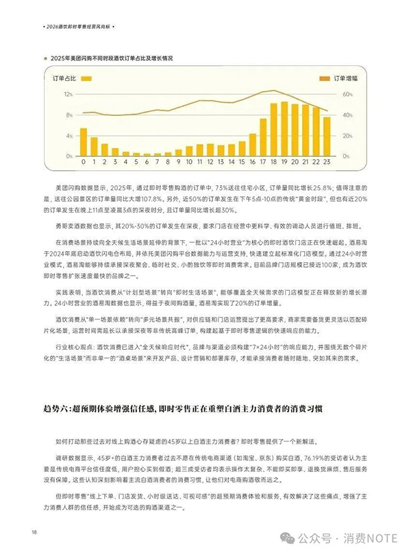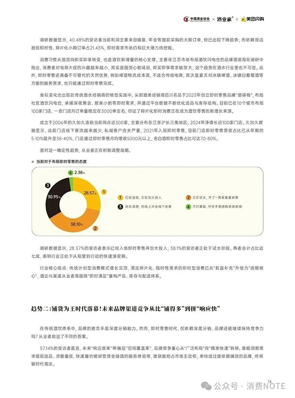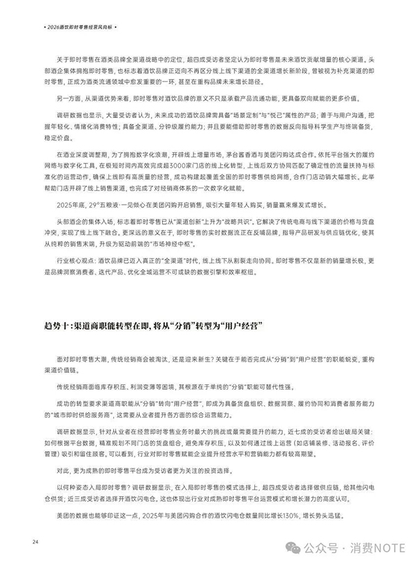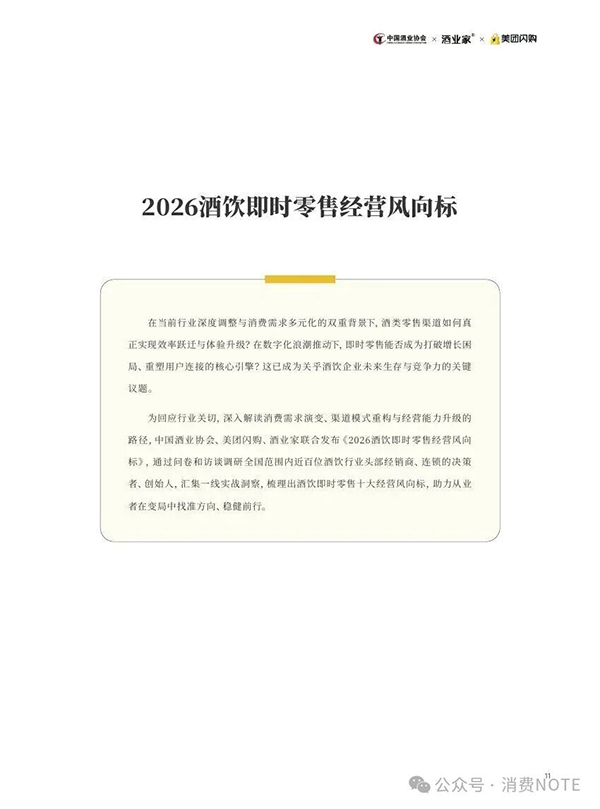 美团闪购联合中国酒类流通协会等机构,与包括品牌、经销商、连锁、闪电仓等百位酒业人士深度访谈后,总结经验、专业提升、发布了《2026酒饮即时零售经营风向标》,对酒业做出全面判断,揭示新周期下十大趋势。